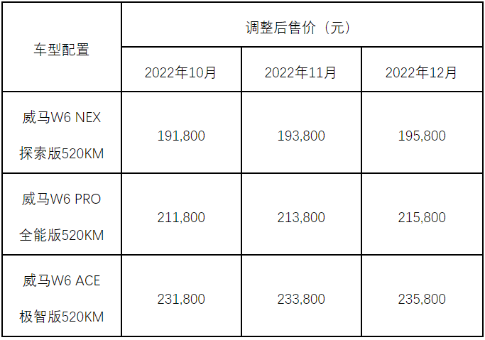 據(jù)悉,因受上游原材料價(jià)格上漲等綜合因素,威馬汽車(chē)將在近期針對(duì)在售車(chē)型威馬W6的價(jià)格進(jìn)行上調(diào)。此次價(jià)格調(diào)整覆蓋“NEX探索版 520KM”、“PRO全能版 520KM”、“ACE極智版 520KM”三款車(chē)型,將于今年第四季度內(nèi)(10-12月)進(jìn)行調(diào)整,每月上調(diào)2000元。三款車(chē)型調(diào)整后綜合補(bǔ)貼售價(jià)分別為:19.58萬(wàn)元、21.58萬(wàn)元、23.58萬(wàn)元。價(jià)格調(diào)整方案將于2022年10月1日零時(shí)起生效,在此之前已完成定金支付的用戶(hù)不受此次價(jià)格調(diào)整影響。(詳情可咨詢(xún)各地威馬汽車(chē)用戶(hù)中心及直營(yíng)店)