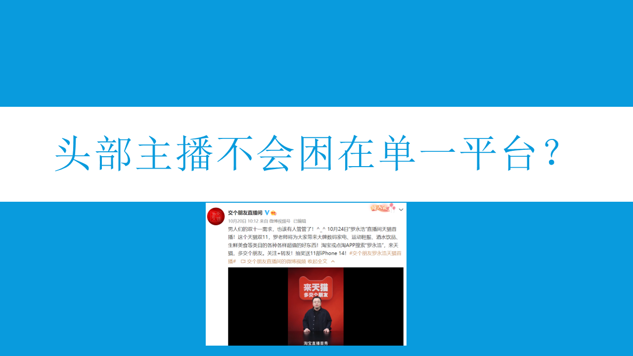 淘系平臺自然是接下來的最佳選擇之一。一方面,淘寶、天貓有著海量的電商用戶群體,在直播帶貨方面有著深厚的底蘊,某種意義上說雙11是淘寶、天貓的主場,借助雙11可以打響在淘系平臺直播帶貨的“第一槍”;另一方面,近年來薇婭、李佳琪等部分淘系平臺頭部主播經(jīng)歷了較大的波折,平臺也亟待新的頭部主播入駐拉臺聲勢。因此,羅永浩和“交個朋友直播間”選擇在淘系平臺發(fā)展,目前來看是一個比較好的契機。