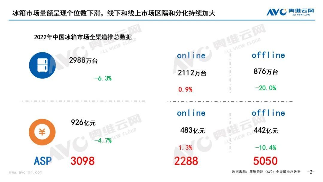 開年伊始,冰箱市場(chǎng)表現(xiàn)慘淡;進(jìn)入5月,隨著疫情逐漸緩解、多地出臺(tái)促消費(fèi)政策以及618促銷節(jié)提前打響,冰箱全渠道零售額同比增長(zhǎng)11.9%,實(shí)現(xiàn)了由負(fù)轉(zhuǎn)正,釋放了市場(chǎng)恢復(fù)的信號(hào);進(jìn)入下半年以來,伴隨疫情反復(fù)、供應(yīng)鏈變化、經(jīng)濟(jì)增速下滑等不利因素,市場(chǎng)需求端的壓力仍較大。從規(guī)模來看,奧維云網(wǎng)(AVC)全渠道推總數(shù)據(jù)顯示,2022年冰箱市場(chǎng)零售量為2988萬臺(tái),同比下滑6.3%;零售額926億元,同比下降4.7%。分渠道來看,隨著線上紅利釋放接近尾聲,增速放緩已降至個(gè)位數(shù),目前來看線上市場(chǎng)對(duì)于冰箱行業(yè)的拉動(dòng)作用正明顯減弱。而疫情之后被重創(chuàng)的線下市場(chǎng)零售量仍處于雙位數(shù)下滑的低迷狀態(tài)。