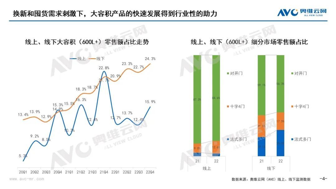 后疫情時(shí)代,消費(fèi)者健康防護(hù)意識(shí)顯著提升,囤貨存儲(chǔ)、精細(xì)化存儲(chǔ)及健康化存儲(chǔ)需求更加迫切。疊加品質(zhì)生活提升下更新?lián)Q代的需求,也為冰箱的大容積升級(jí)趨勢(shì)提供了有力支撐。線上市場(chǎng)來看,大容積產(chǎn)品的銷額占比從2020年一季度的5.3%增長(zhǎng)至2022年四季度的15.9%,線下這一比例則是由13.4%增長(zhǎng)至24.3%。