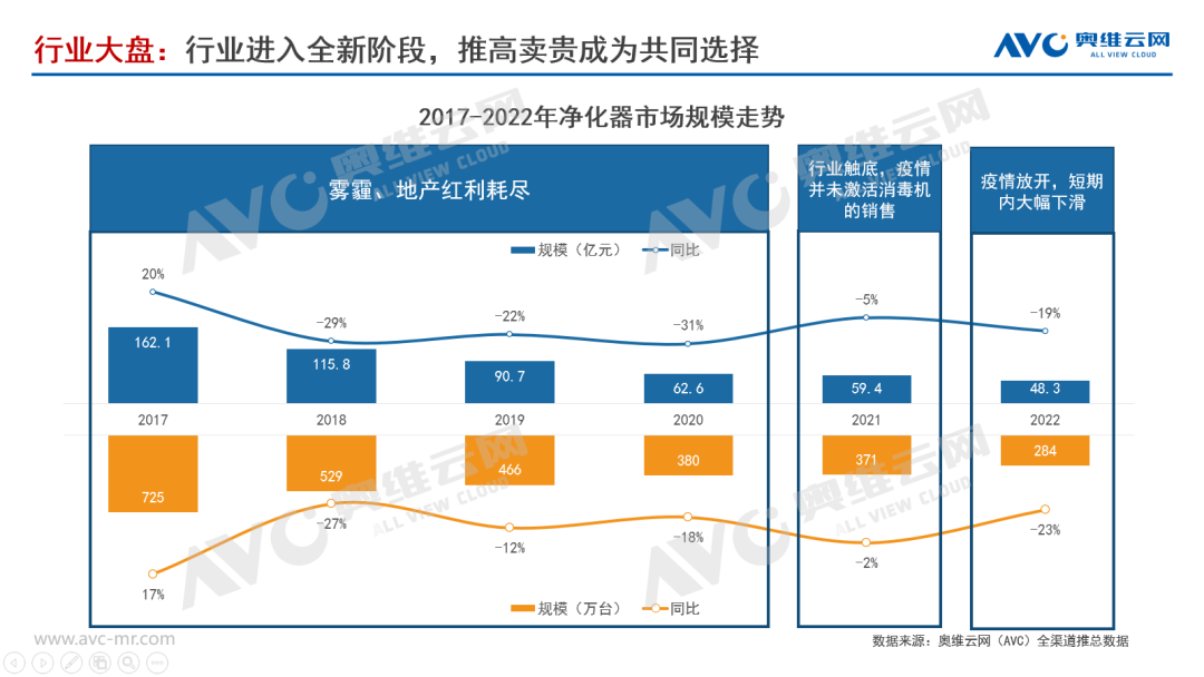 伴隨著新十條、入境檢疫放寬、乙類乙管等疫情政策的全面放開及房地產(chǎn)寬松政策的發(fā)布等好消息傳來的同時,2022年終于結(jié)束,回顧2022年,無論是前半年疫情帶來的大規(guī)模封控,還是年底剛放開時的大規(guī)模感染,都給本就不太景氣的凈化器行業(yè)帶來重創(chuàng),奧維云網(wǎng)(AVC)全渠道推總數(shù)據(jù)顯示,2022年空氣凈化器行業(yè)零售額48.3億元,同比-19%,零售量284萬臺,同比-23%,是自19年以來需求萎縮幅度最大的一年,但隨著大家開始“陽康”,以及明年房地產(chǎn)、內(nèi)需的刺激性政策,預(yù)計今年凈化器行業(yè)降幅將會大幅收窄。