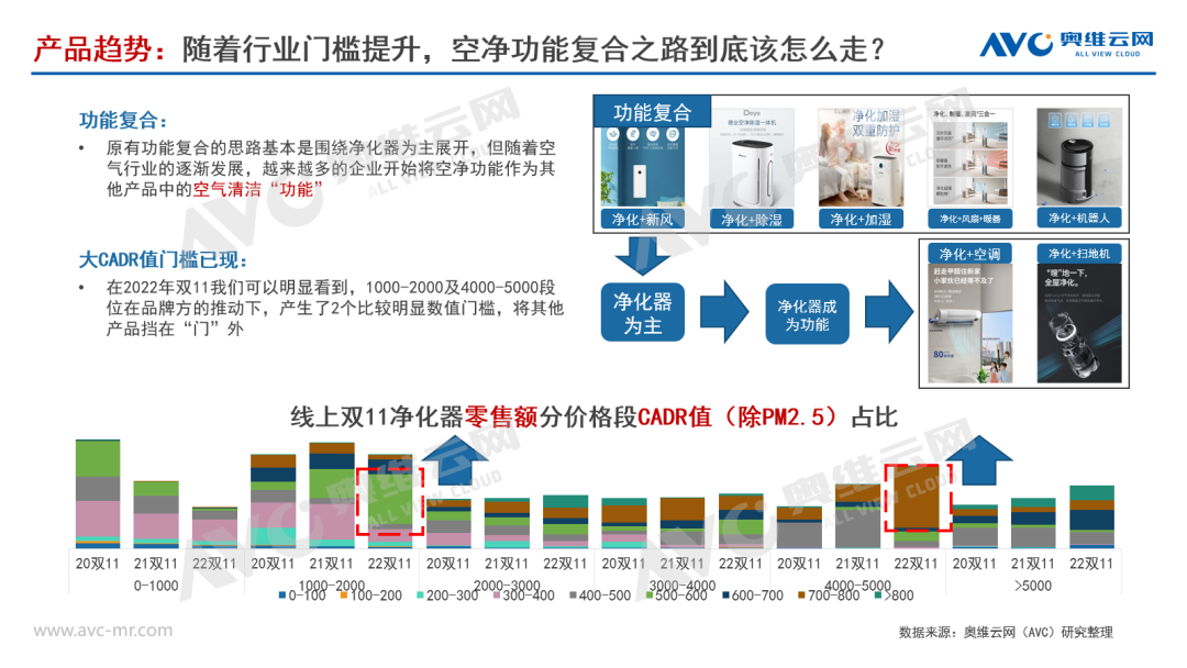 回顧2022年的整個空氣治理行業(yè),我們可以發(fā)現(xiàn)很多能對凈化器產(chǎn)生沖擊的品類,有一些甚至是融合了凈化器的部分功能,比如凈化空調(diào),帶凈化器的掃地機(jī)器人基站等等,隨著整個家電市場的需求萎縮,如何搶“別人”的份額,已經(jīng)成為每一個企業(yè)必須考慮的問題,隨之而來的必然是更多的跨界融合產(chǎn)品的出現(xiàn),但短期來看,除了需要產(chǎn)品本身需求(如對空調(diào)、掃地機(jī)器人本身的功能的需求)的用戶,僅從空氣凈化的角度講,對現(xiàn)有產(chǎn)品有一定的沖擊,但是現(xiàn)有凈化器產(chǎn)品仍有很強(qiáng)不可替代性,從長期來看,隨著市場的發(fā)展,品類融合仍是未來產(chǎn)品的大趨勢,相信未來會有越來越多的產(chǎn)品開始融合凈化器的功能。而從凈化器本身出發(fā),需求萎縮則倒逼了品牌方不斷推高賣貴,保證經(jīng)營質(zhì)量和利潤,同樣也在倒逼企業(yè)不斷創(chuàng)新,提升產(chǎn)品功能參數(shù)和產(chǎn)品體驗(yàn),而在2022年線上市場,我們已經(jīng)可以明顯看到這個苗頭,在1000+及4000+段位,PM2.5及除甲醛參數(shù)都有很大的升級,行業(yè)入門的門檻被逐漸提高。