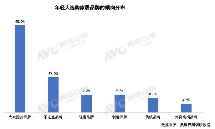 根據(jù)調(diào)研數(shù)據(jù),近半數(shù)年輕人在選購(gòu)家居產(chǎn)品時(shí)傾向于選擇大眾國(guó)貨品牌,不盲目追求高端、大牌等;整體來(lái)看年輕人在家居產(chǎn)品選購(gòu)決策時(shí)更看重產(chǎn)品的樣式、功能、使用便利性等,對(duì)于傳統(tǒng)固有品牌認(rèn)知逐步弱化、消費(fèi)習(xí)慣走向務(wù)實(shí)。