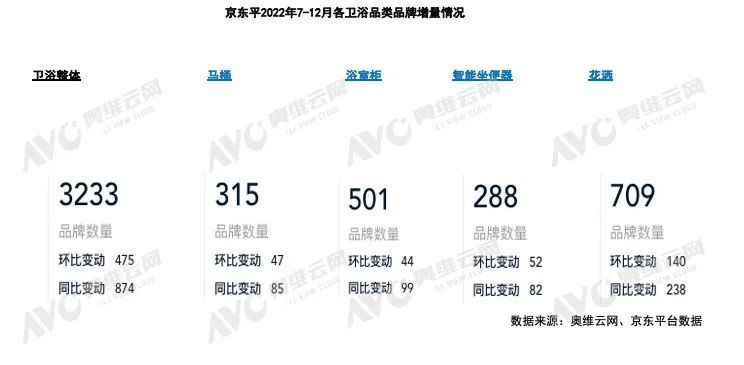 疫情以來(lái),消費(fèi)者線上的購(gòu)物習(xí)慣全面養(yǎng)成,其在衛(wèi)浴消費(fèi)上也呈現(xiàn)了明顯的增量態(tài)勢(shì)。衛(wèi)浴企業(yè)抓住機(jī)遇積極布局線上,快速布局。根據(jù)監(jiān)測(cè)數(shù)據(jù),京東平臺(tái)2022年底衛(wèi)浴品牌共計(jì)3233家,僅2022年下半年增量475家,相較于去年同期增加了874家,增幅達(dá)到37%。
