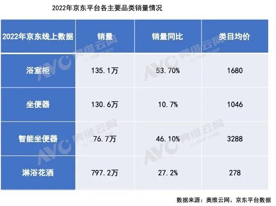 從品類(lèi)上看,以浴室柜、智能坐便器、花灑為代表的三大品類(lèi)2022年線上銷(xiāo)量增勢(shì)明顯,平均增幅超過(guò)34%;