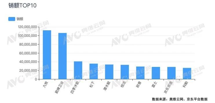 從品牌上看,衛(wèi)浴國(guó)產(chǎn)品牌當(dāng)前占據(jù)線上銷(xiāo)售的優(yōu)勢(shì)地位,京東平臺(tái)銷(xiāo)量、銷(xiāo)額TOP10企業(yè)以國(guó)產(chǎn)品牌為主。