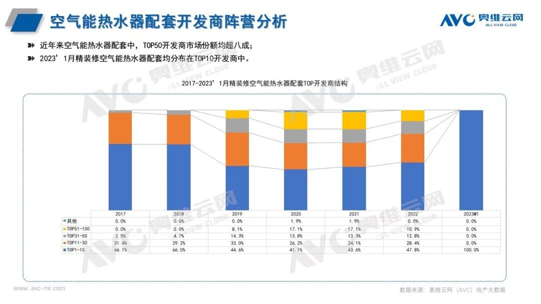 從近年空氣能熱水器市場(chǎng)來看,近年來空氣能熱水器主力戰(zhàn)場(chǎng)始終是華東區(qū)。從近年城市等級(jí)分布來看,空氣能熱水器集中分布在新一線城市和二線城市中,合計(jì)份額均在七成以上,從單個(gè)城市來看,近年來空氣能熱水器重點(diǎn)城市主要為杭州,寧波、紹興、溫州等,從開發(fā)商陣營(yíng)來看,近年來空氣能熱水器配套中,TOP50開發(fā)商市場(chǎng)份額均超八成,其中TOP10開發(fā)商市場(chǎng)份額均為40%以上, 2023年1月精裝修市場(chǎng)空氣能熱水器配套均分布在TOP10開發(fā)商中。