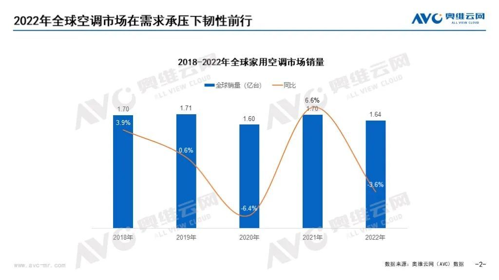 2022年對于全球及中國家用空調市場來說是極為不平凡的一年,俄烏戰(zhàn)爭造成全球政經和貿易格局急劇變化,全球經濟面臨新的挑戰(zhàn)。美國加息導致美元回流全球資本緊縮、歐洲通貨膨脹持續(xù)攀升、東南亞市場面臨需求不足和庫存高位雙重挑戰(zhàn);國內市場在疫情擾動、地產下行、消費信心不足等影響下也是節(jié)奏紊亂市場高度承壓。奧維云網(AVC)《2022年全球家用空調市場年度總結報告》數(shù)據(jù)顯示,2022年全球家用空調市場銷量1.64億臺,同比下滑3.6%,總體而言,2022年全球及中國空調市場在外部環(huán)境不佳造成的需求不足中韌性前行,市場規(guī)?;痉€(wěn)定、企業(yè)經營質量大幅改善,行業(yè)發(fā)展從規(guī)模驅動向高質量發(fā)展轉型。