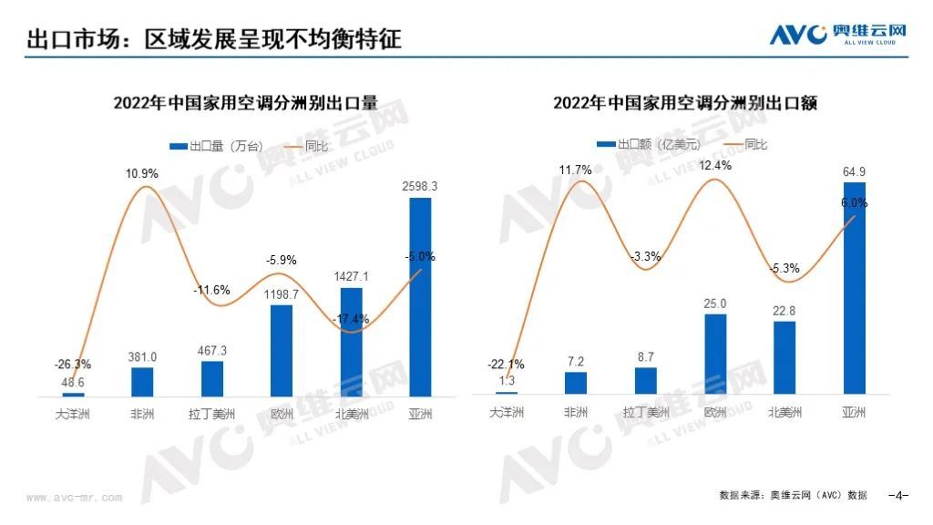 出口市場來看,亞洲作為出口規(guī)模最大的市場,基本盤相對穩(wěn)定;北美市場的庫存釋放仍需時間,預計2023年仍將持續(xù)下行;歐洲市場雖然潛力較大,但消費習慣改變需循序漸進,短期難以起量。整體而言,2023年出口市場仍然有較大壓力,根據(jù)奧維云網(AVC)預測數(shù)據(jù),2023年家用空調出口量規(guī)模預計下滑7.6%。但價格提升和結構改善仍將為行業(yè)高質量發(fā)展提供重要支撐。