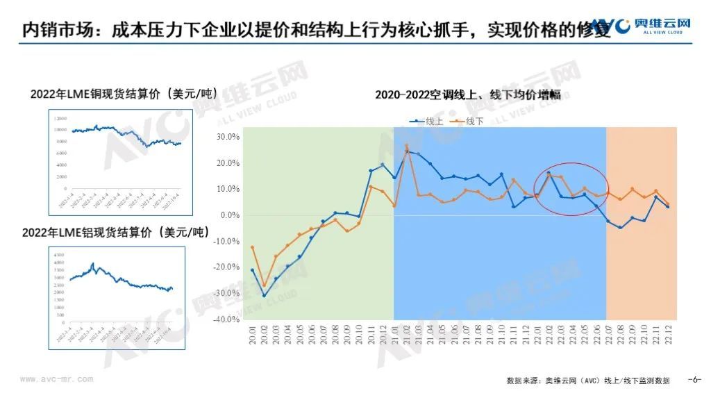 2022年整個上半年,原材料成本一直處于高位,企業(yè)壓力巨大,因此即便在市場需求不振的情況下仍然無奈選擇了提價。根據(jù)奧維云網(AVC)監(jiān)測數(shù)據(jù), 2月份空調零售市場線上、線下均價增幅均超過15%。另一方面,企業(yè)也著力通過產品升級、創(chuàng)新實現(xiàn)結構的改善:2匹掛機、新風空調、智能語音空調等滲透率明顯提升,掛機的高端占比增幅明顯。