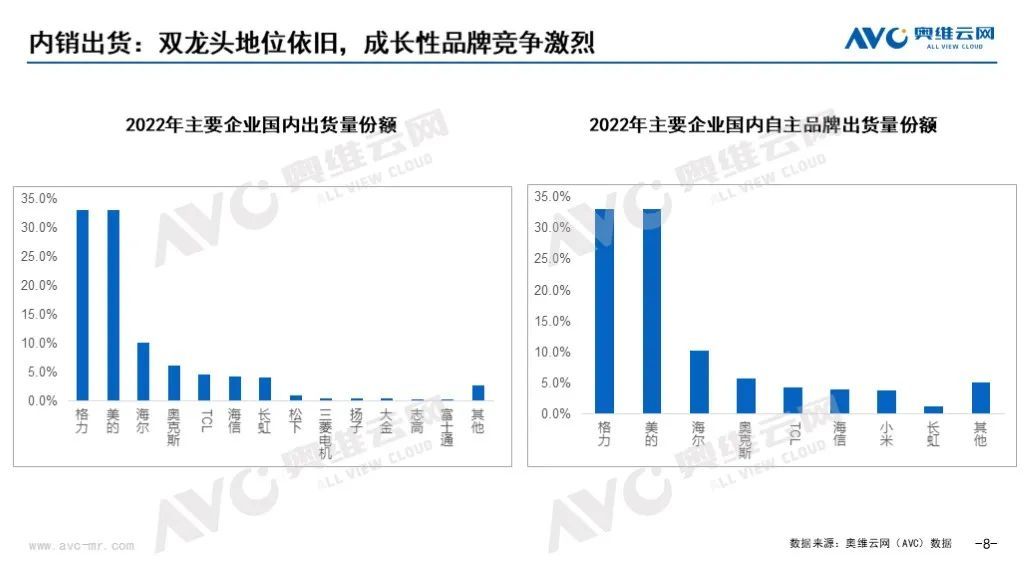 頭部品牌的堅定提價和積極修復產業(yè)價值鏈,也給追趕品牌和成長性企業(yè)留出了發(fā)展空間。海爾在2022年通過內外部資源整合,營銷端積極發(fā)力、通過產品聚焦、零售網絡拓展和線上重點突破等措施取得了市場份額大幅提升。2022年海爾空調市場份額提升2.77個百分點,成為行業(yè)市場份額提升最大的品牌。海信、奧克斯、TCL以及長虹等品牌也各自通過結構提升、零售轉型、區(qū)域市場精耕細作在經營質量上大幅改善。值得一提的是,小米在進入空調產業(yè)多年后在2022年終于迎來了大幅增長實現(xiàn)了階段性臺階跨越,根據(jù)奧維云網(AVC)數(shù)據(jù),2022年小米自主品牌出貨已突破300萬臺。此外,2022年也是成長性企業(yè)快速成長的一年,康佳 、澳柯瑪 、美博 、揚子、月兔、榮事達、飛利浦、創(chuàng)維、松下、三菱電機等品牌用差異化產品和高性價產品通過快速擁抱抖拼快等新興電商渠道,持續(xù)精耕細作傳統(tǒng)分銷渠道,在新零售渠道、工程市場、細分區(qū)域和傳統(tǒng)渠道等市場取得良好業(yè)績。