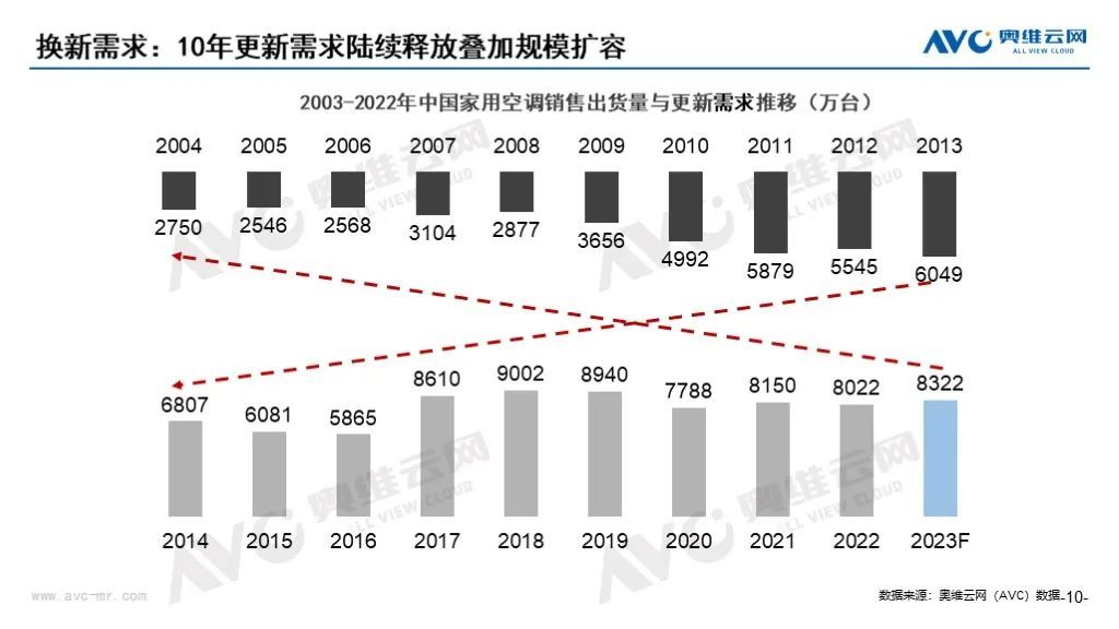 2022年夏季受疫情及防控政策影響,空調上門安裝面臨困難,導致相當一部分2022年的換新需求受到抑制。同時,2012-2014年間,在節(jié)能惠民政策推動下,國內空調銷量實現(xiàn)爆發(fā)式增長,如今這部分產品已經到達10年的更新?lián)Q代周期。2023年隨著疫情影響消退以及企業(yè)和政府聯(lián)合推廣、以舊換新等消費政策刺激下,空調換新需求有望集中釋放。
