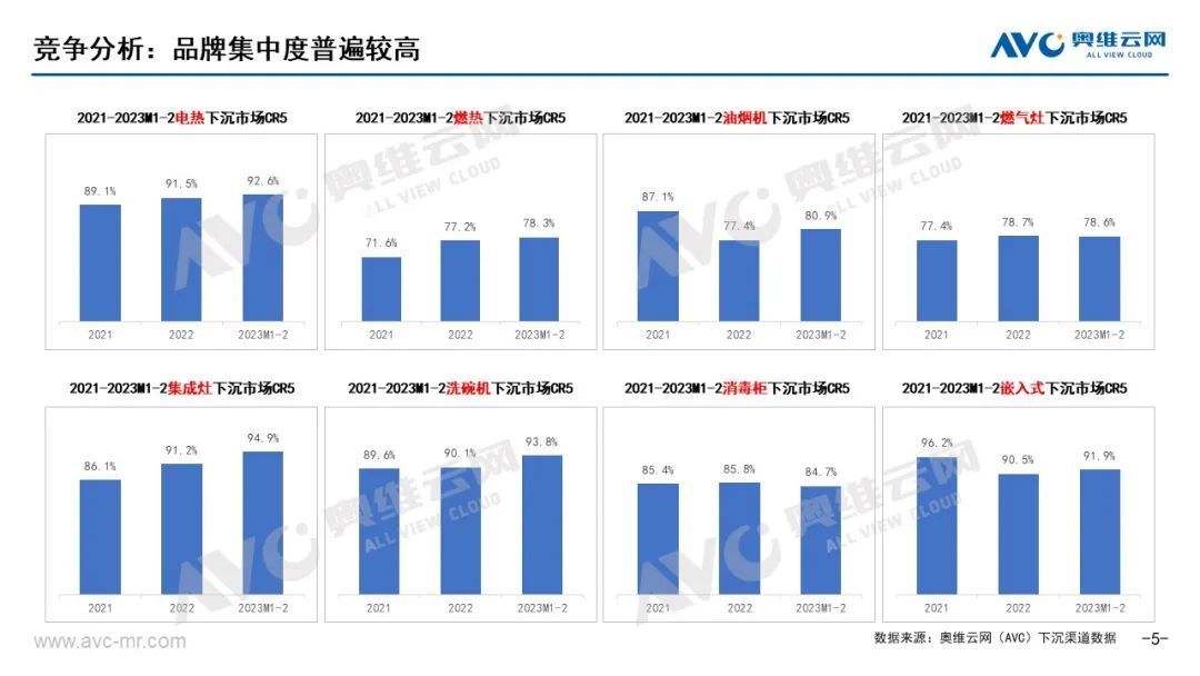 下沉市場用戶對品牌的敏感度較高,更傾向于購買綜合知名品牌和專業(yè)知名品牌。據(jù)奧維云網(wǎng)(AVC)下沉監(jiān)測數(shù)據(jù)顯示,2023年1-2月,電熱、洗嵌集的CR5超過90%,并且呈上升趨勢。而煙灶消、燃熱的集中度也已超過75%,廚衛(wèi)下沉渠道頭部品牌集中度整體較高。