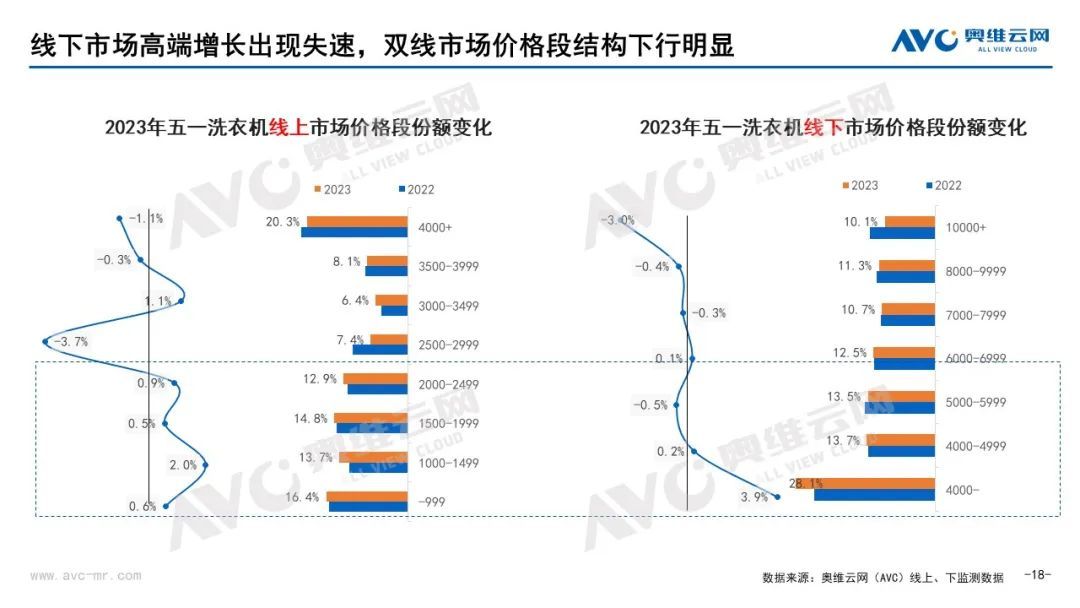 從價(jià)格結(jié)構(gòu)來(lái)看,線上市場(chǎng)價(jià)格戰(zhàn)影響仍在,細(xì)分品類(lèi)除單雙缸外均價(jià)普遍下滑,奧維云網(wǎng)(AVC)監(jiān)測(cè)數(shù)據(jù)顯示,線上2500元以下價(jià)格段零售額份額提升4.0%。線下市場(chǎng)細(xì)分品類(lèi)均價(jià)均有提升,但由于洗烘一體的占比下滑,導(dǎo)致價(jià)格結(jié)構(gòu)開(kāi)始向中低端市場(chǎng)傾斜,奧維云網(wǎng)線下監(jiān)測(cè)數(shù)據(jù)顯示,線下4000元一下價(jià)格段零售額份額提升3.9%。(戳→奧維數(shù)據(jù)羅盤(pán))