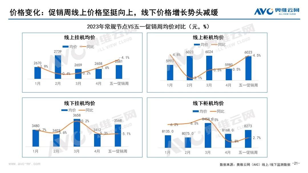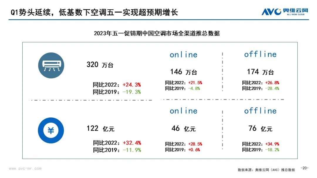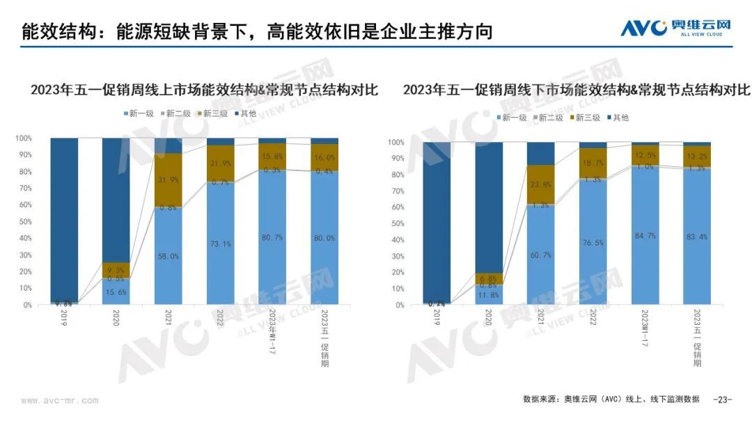 空調(diào):Q1勢(shì)頭延續(xù),低基數(shù)下空調(diào)五一實(shí)現(xiàn)超預(yù)期增長(zhǎng)。奧維云網(wǎng)(AVC)推總數(shù)據(jù)顯示,五一促銷(xiāo)期空調(diào)零售額122億元,同比增長(zhǎng)32.4%,零售量320萬(wàn)臺(tái),同比增長(zhǎng)24.3%。從價(jià)格角度來(lái)看,線上一季度競(jìng)爭(zhēng)激烈,反而到促銷(xiāo)季價(jià)格堅(jiān)挺持續(xù)向上。線下則是堅(jiān)持推高端,均價(jià)增幅高于線上。從產(chǎn)品趨勢(shì)看,變頻掛機(jī)占比穩(wěn)步增長(zhǎng),柜機(jī)受到大匹數(shù)掛機(jī)和風(fēng)管機(jī)的影響,份額也在持續(xù)萎縮,未來(lái)方向還是會(huì)圍繞高端做突破。定速掛機(jī)死灰復(fù)燃,市場(chǎng)對(duì)于高性?xún)r(jià)比產(chǎn)品的需求依然有。能效角度看,在全球能源危機(jī)大背景下,一級(jí)能效依然會(huì)是企業(yè)主推的方向,目前頭部品牌一級(jí)能效占比均在90%以上,行業(yè)整體的能效結(jié)構(gòu)提升更多需要腰部品牌的拉動(dòng)。二季度市場(chǎng)來(lái)看,我們持樂(lè)觀積極態(tài)度。