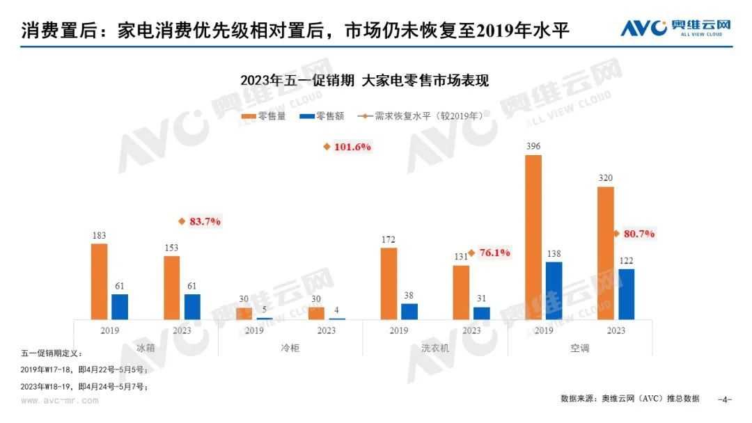 伴隨國(guó)內(nèi)疫情防控進(jìn)入穩(wěn)定狀態(tài),消費(fèi)信心穩(wěn)步恢復(fù),居民高漲的出行需求也在五一假期得到充分釋放。在各地消費(fèi)刺激政策的加持下,五一消費(fèi)市場(chǎng)一片火熱,餐飲、服務(wù)類(lèi)消費(fèi)全面增長(zhǎng),這反映出國(guó)內(nèi)消費(fèi)市場(chǎng)仍存在巨大潛力。但在整體居民消費(fèi)結(jié)構(gòu)中,大家電優(yōu)先級(jí)相對(duì)后置,雖然消費(fèi)信心顯著回暖,然而大家電市場(chǎng)距離恢復(fù)至2019年水平仍有一定差距。