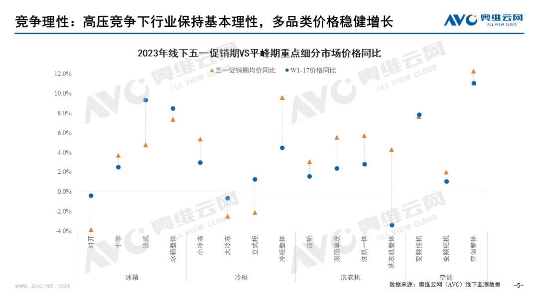 奧維云網(wǎng)(AVC)推總數(shù)據(jù)顯示,除冷柜外,冰洗空大家電的五一需求釋放水平不足2019年的85%。盡管規(guī)模修復(fù)仍有一定壓力,但市場(chǎng)仍維持著基本的競(jìng)爭(zhēng)理性,尤其是線下市場(chǎng),重點(diǎn)品類(lèi)的價(jià)格在五一期間保持了一定的增長(zhǎng)慣性。從渠道結(jié)構(gòu)看,線下實(shí)體經(jīng)濟(jì)有效恢復(fù),帶動(dòng)大家電市場(chǎng)線下占比穩(wěn)步回升。奧維云網(wǎng)(AVC)推總數(shù)據(jù)顯示,五一促銷(xiāo)期,冰洗空線下零售額占比均超過(guò)60%。