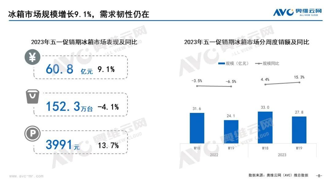 冰箱:零售規(guī)模增長(zhǎng),需求韌性仍在。奧維云網(wǎng)(AVC)推總數(shù)據(jù)顯示,五一促銷(xiāo)期冰箱市場(chǎng)零售額規(guī)模60.8億元,同比增長(zhǎng)9.1%,零售量規(guī)模152.3萬(wàn)臺(tái),同比下滑4.1%。結(jié)構(gòu)升級(jí)趨勢(shì)仍在繼續(xù),從價(jià)格表現(xiàn)來(lái)看,全渠道均價(jià)3991元,同比上漲13.7%;從門(mén)體結(jié)構(gòu)來(lái)看,行業(yè)進(jìn)一步聚焦法式多門(mén)、十字4門(mén),據(jù)奧維云網(wǎng)(AVC)監(jiān)測(cè)數(shù)據(jù),五一促銷(xiāo)期間,線上市場(chǎng)十字產(chǎn)品零售額份額擴(kuò)大至32.6%,法式多門(mén)產(chǎn)品零售額份額13.4%,線下市場(chǎng)十字4門(mén)產(chǎn)品零售額份額37.3%,法式多門(mén)產(chǎn)品零售額份額30.5%;從價(jià)格結(jié)構(gòu)來(lái)看,高端進(jìn)程持續(xù)加快,線上6K+市場(chǎng)占比擴(kuò)大2.4%,線下10K+高端市場(chǎng)份額增長(zhǎng)4.6%。