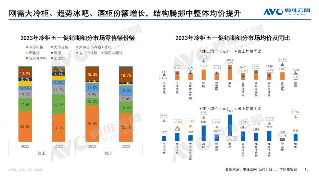 冷柜:應(yīng)急需求回落,冷柜進(jìn)入結(jié)構(gòu)調(diào)整期。奧維云網(wǎng)(AVC)推總數(shù)據(jù)顯示,五一促銷(xiāo)期冷柜市場(chǎng)零售額規(guī)模3.6億元,同比下滑31.6%,零售量規(guī)模30萬(wàn)臺(tái),同比下滑33.3%。從品類(lèi)結(jié)構(gòu)來(lái)看,剛需大冷凍柜需求仍在,趨勢(shì)品類(lèi)冰吧、酒柜份額增長(zhǎng),線下立式冷凍柜份額表現(xiàn)穩(wěn)健。奧維云網(wǎng)(AVC)監(jiān)測(cè)數(shù)據(jù)顯示,線上市場(chǎng)冰吧零售額份額6.7%,酒柜零售額份額4.4%;線下市場(chǎng)冰吧零售額占比13.3%,酒柜零售額占比1.8%。品類(lèi)結(jié)構(gòu)升級(jí)下,價(jià)格結(jié)構(gòu)上行,據(jù)奧維云網(wǎng)(AVC)監(jiān)測(cè)數(shù)據(jù),線上市場(chǎng)1400+產(chǎn)品占比擴(kuò)大2.1%,線下2K+產(chǎn)品占比增長(zhǎng)7.0%。