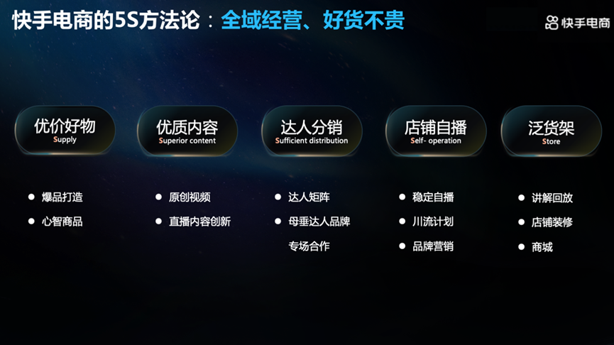 為幫助品牌商家在快手科學(xué)經(jīng)營、快速成長,快手電商還提出“5S方法論”,包括優(yōu)價(jià)好物、優(yōu)質(zhì)內(nèi)容、達(dá)人分銷、店鋪?zhàn)圆?、泛貨架五個(gè)要素,可劃分為好內(nèi)容+好貨品、好渠道兩大部分,讓品牌商家真正在快手做到“全域經(jīng)營、好貨不貴”。