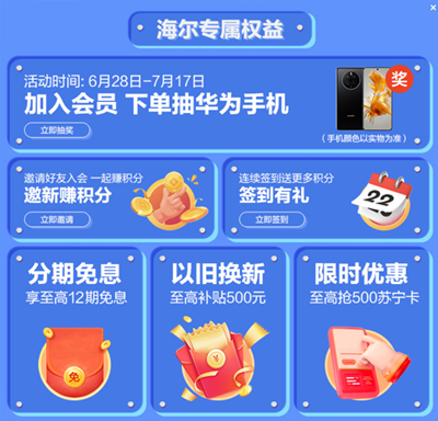 717燃購節(jié)期間,蘇寧易購與海爾聯(lián)名推出了新款Super會員卡,年費(fèi)為149元,可得一張無門檻的150元海爾無敵券,相當(dāng)于買一單即回本。