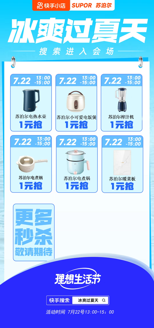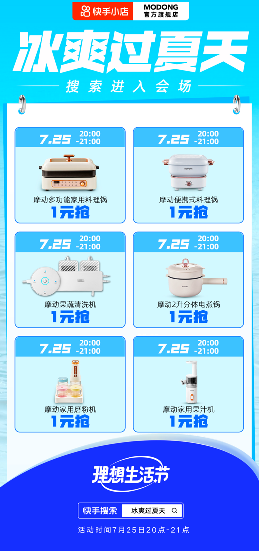 會(huì)場(chǎng)是此次活動(dòng)的重要經(jīng)營(yíng)場(chǎng)域之一??焓蛛娚淘谥鲿?huì)場(chǎng)搭建不同的商品樓層,包括“清涼好物推薦官”海景房、“1元搶購(gòu) 盛夏狂歡”低價(jià)秒殺樓層、“巔峰大牌狂歡趴”會(huì)員樓層、“重磅新品 好價(jià)先享”品牌新品專屬樓層以及各品類主題商品樓層,全方位為商家?guī)砹髁科毓?,助力商品轉(zhuǎn)化。蘇泊爾、九陽(yáng)、摩動(dòng)等品牌將在會(huì)場(chǎng)啟動(dòng)一元秒殺活動(dòng),拓展經(jīng)驗(yàn)場(chǎng)域,實(shí)現(xiàn)不同場(chǎng)域流量互動(dòng)。