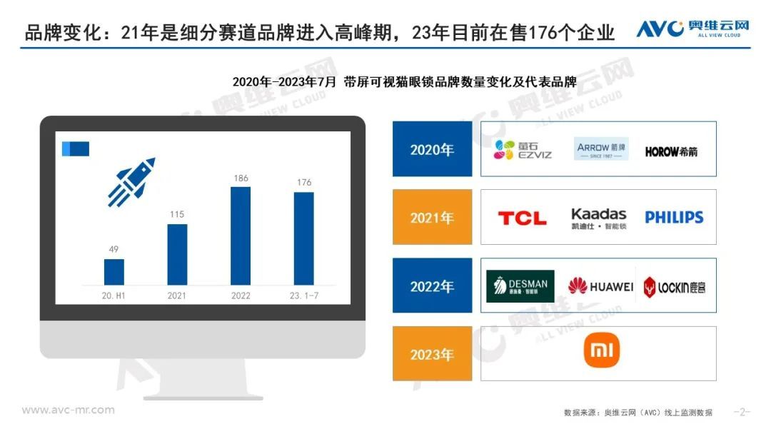 在2020年,帶屏可視貓眼鎖便已經(jīng)形成了一定的規(guī)模,據(jù)奧維云網(wǎng)(AVC)線上監(jiān)測(cè)數(shù)據(jù)顯示,有49個(gè)品牌在售,其中代表品牌有螢石,箭牌,希箭等。到2021年,參與品牌開始呈現(xiàn)爆發(fā)式增長(zhǎng),截止2023年7月,在售品牌已經(jīng)逼近200家;頭部品牌中,TCL、凱迪仕、飛利浦率先在2021年切入賽道,德施曼、華為、鹿客在2022年隨后跟進(jìn),小米進(jìn)入相對(duì)較晚,首款產(chǎn)品在2023年發(fā)布;至此,頭部品牌均發(fā)布了帶屏可視貓眼鎖。