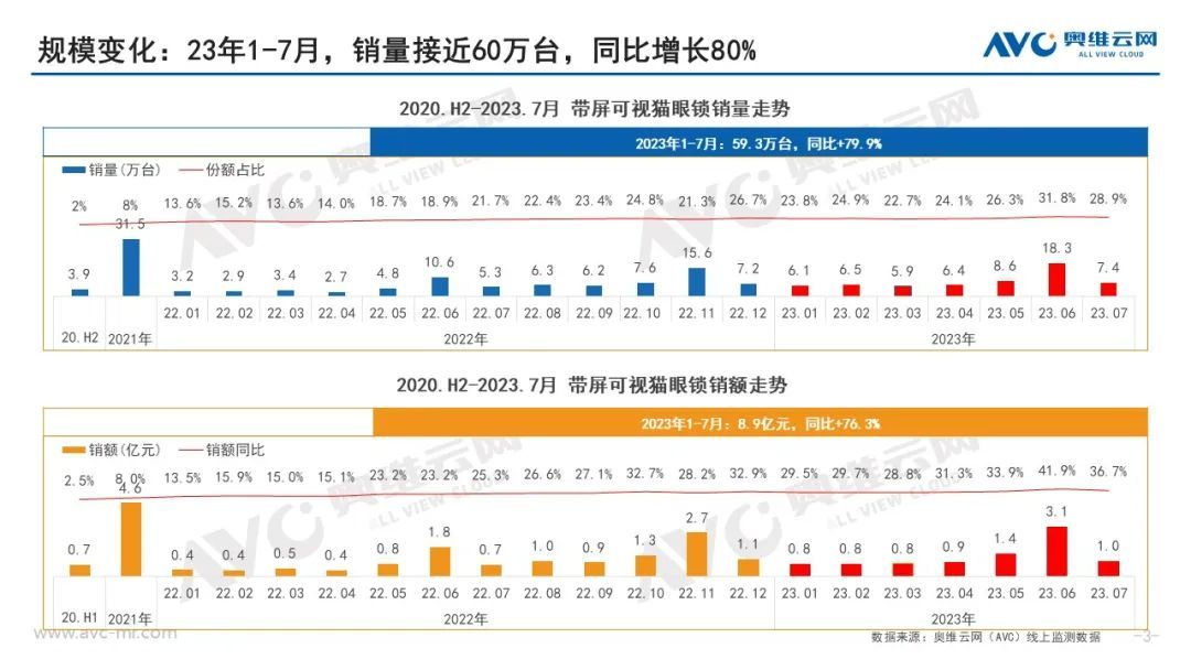 當(dāng)前,帶屏可視貓眼鎖已經(jīng)成為行業(yè)發(fā)展勢(shì)頭最為強(qiáng)勁的細(xì)分領(lǐng)域,帶屏可視在增強(qiáng)安防等級(jí)的同時(shí),也為后續(xù)更多人性化功能的發(fā)布帶來更多的創(chuàng)造性。據(jù)奧維云網(wǎng)(AVC)線上監(jiān)測(cè)數(shù)據(jù)顯示,2021年,帶屏可視貓眼鎖銷量為31.5萬臺(tái),份額占比僅為8%,到2022年,銷量已增至75.9萬臺(tái),同比增長(zhǎng)141%,銷量份額達(dá)到20%;而到2023年1-7月,銷量份額進(jìn)一步提升至27%,已有59.3萬臺(tái),同比增幅80%,市場(chǎng)增長(zhǎng)空間依舊巨大。