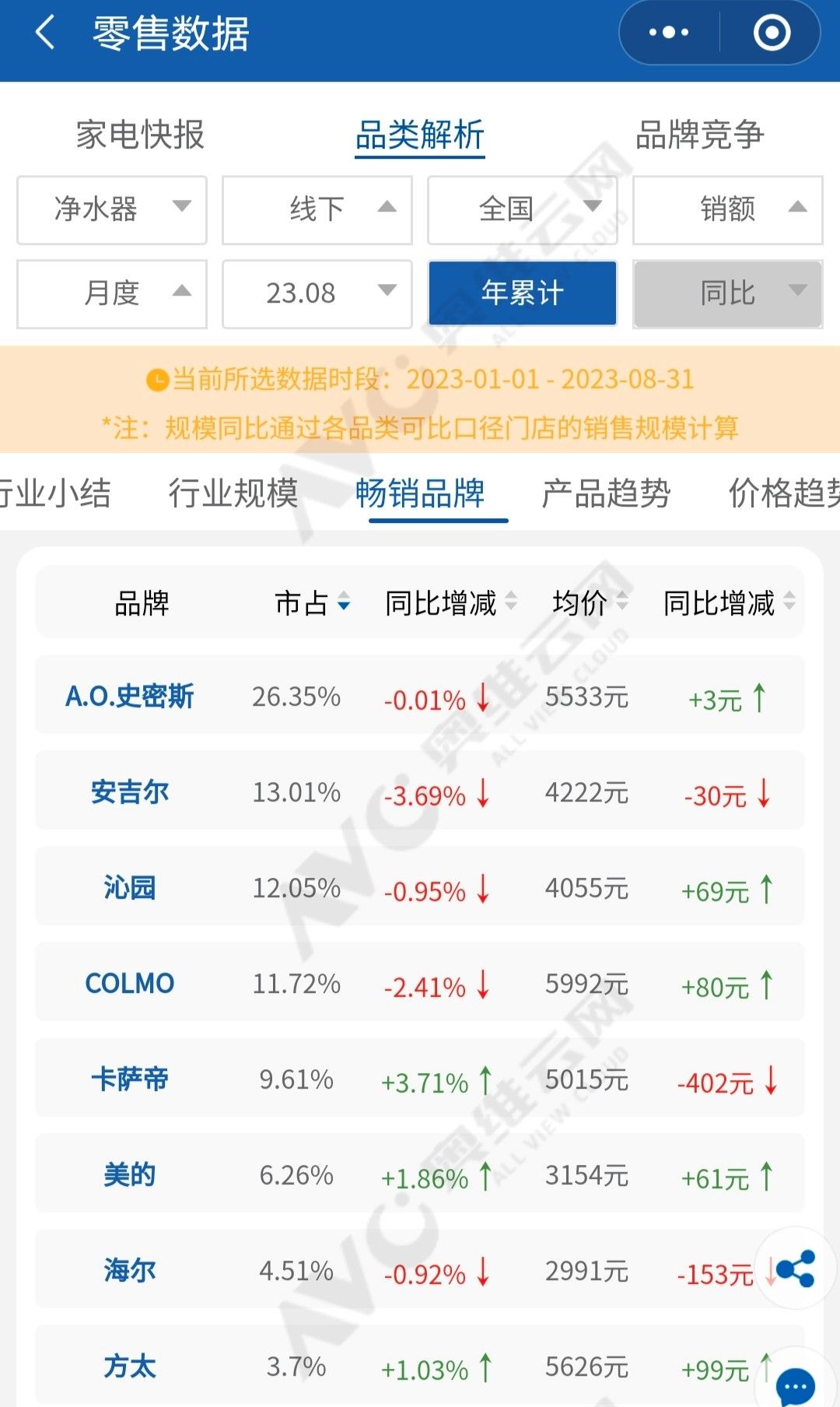 不僅線上市場穩(wěn)健增長,線下市場凈水器同樣保持增長態(tài)勢。1-8月,線下凈水器市場銷量、銷售額同比分別增長6.12%、5.36%。