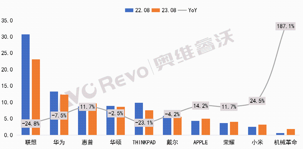 頭部品牌來(lái)看,聯(lián)想華為仍排名一二,其中8月聯(lián)想銷(xiāo)量同比大幅下滑24.8%,但排名仍維持第一。華為產(chǎn)品線(xiàn)較為單一,陷入增長(zhǎng)瓶頸,市場(chǎng)份額位列第二,8月銷(xiāo)量同比下滑7.5%。