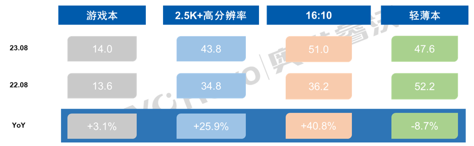 2.5K以上的高分辨率機(jī)型以及16:10機(jī)型延續(xù)了增長(zhǎng)的勢(shì)頭,隨著2.5K分辨率向低價(jià)位段滲透,高分辨率機(jī)型總體規(guī)模進(jìn)一步增長(zhǎng)。16:10機(jī)型最開(kāi)始由聯(lián)想主推,之后應(yīng)用范圍進(jìn)一步擴(kuò)大,其“多看一行”的賣(mài)點(diǎn)也逐步被商務(wù)本市場(chǎng)所接受,8月2.5K+高分辨率機(jī)型銷(xiāo)量同比增長(zhǎng)25.9%,16:10機(jī)型銷(xiāo)量同比增長(zhǎng)40.8%。
