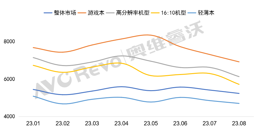 8月市場(chǎng)主要以低價(jià)機(jī)型銷(xiāo)售為主,各品類(lèi)均價(jià)進(jìn)一步下降。8月整體市場(chǎng)全品類(lèi)機(jī)型均價(jià)環(huán)比下降179元至5227元,游戲本均價(jià)環(huán)比下降379元至6909元,高分辨率機(jī)型在低價(jià)格滲透的作用下,均價(jià)環(huán)比下降492元至6121元,16:10機(jī)型擴(kuò)張商務(wù)市場(chǎng),8月均價(jià)環(huán)比下降492元至6121元,輕薄本月均價(jià)環(huán)比下降492元至5696元。