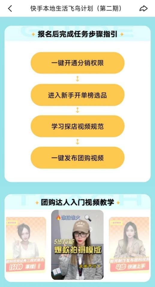 值得關(guān)注的是,本次“飛鳥計劃”開辟出更多樣的活動玩法,提供新手任務(wù)、新星任務(wù)、出道任務(wù)等不同階段任務(wù),達人按照要求帶話題#飛鳥計劃 發(fā)布帶團購商品視頻,完成任務(wù),即可不斷進階,獲得更多獎勵。