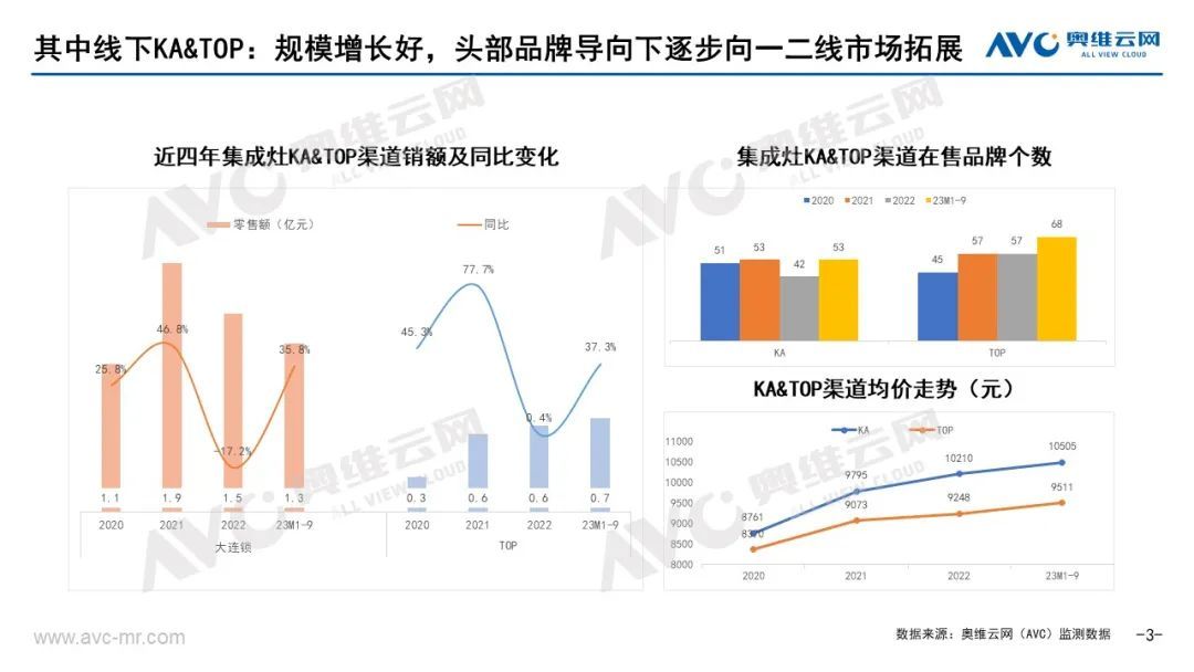 據(jù)奧維云網(wǎng)(AVC)監(jiān)測數(shù)據(jù)顯示,2023年前三季度,KA渠道集成灶累計零售額1.3億元,同比增長35.8%;TOP客戶渠道累計零售額0.7億元,同比增長37.3%。雖然整體規(guī)模較小,但是規(guī)模增長迅速。同時,KA和TOP渠道是集成灶向一二線市場轉(zhuǎn)移、強化集成灶家電屬性、展示品牌形象的重要途徑,在頭部品牌的帶動下企業(yè)紛紛進入。據(jù)奧維云網(wǎng)(AVC)監(jiān)測數(shù)據(jù)顯示,2023年前三季度,KA渠道在售品牌數(shù)量53個,相較于去年全年增長11個;TOP渠道在售品牌數(shù)量為68個,相較于去年全年增加11個。未來,KA和TOP渠道可以作為企業(yè)的儲備賽道,逐漸進行布局。