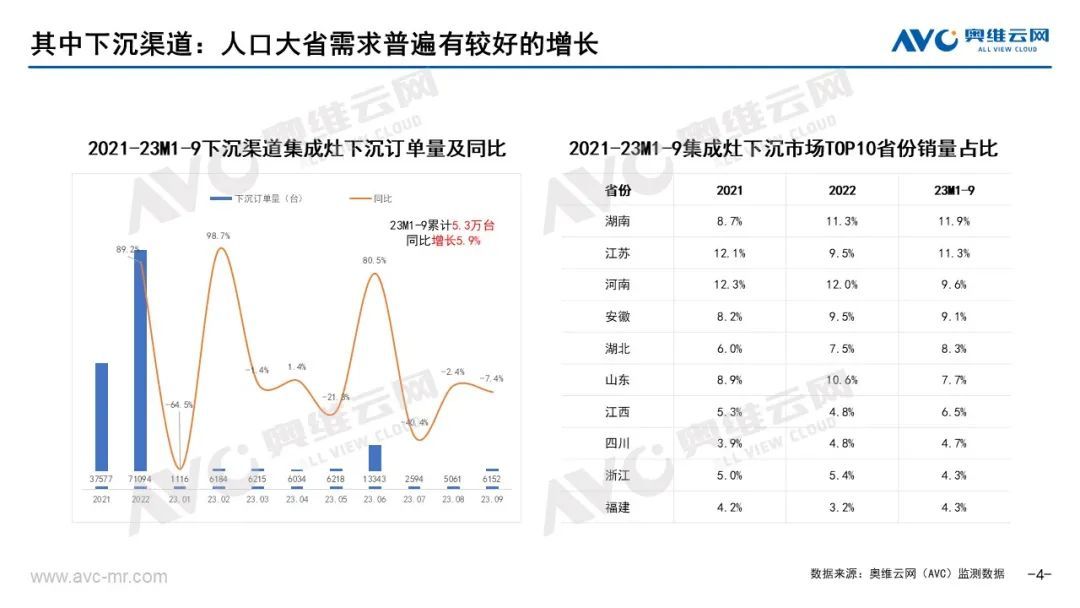 據(jù)奧維云網(wǎng)(AVC)監(jiān)測數(shù)據(jù)顯示,2023年前三季度,下沉渠道集成灶下沉訂單量為5.3萬臺,同比增長5.9%。在需求的區(qū)域分布上,人口大省普遍有著良好的增長。下沉渠道作為家電市場唯一“藍?!保稍钇奉惾杂虚_拓機會。同時,隨著下沉渠道經(jīng)營模式由分銷向零售的不斷轉(zhuǎn)移,市場的可操作性和規(guī)范性將得到進一步的提升,也給集成灶企業(yè)帶來了更多機會。