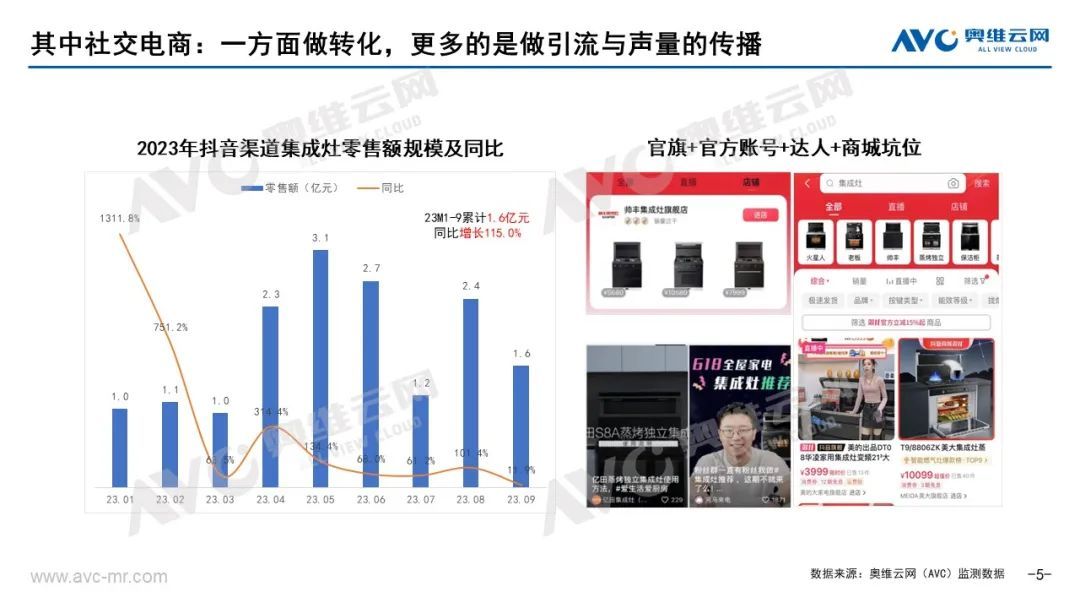 據(jù)奧維云網(wǎng)(AVC)監(jiān)測數(shù)據(jù)顯示,2023年前三季度,抖音電商集成灶零售額為1.6億元,同比增長115%。社交平臺作為消費者信息來源的重要途徑,要一方面做產(chǎn)品的銷售轉(zhuǎn)化,另一方面要發(fā)揮平臺優(yōu)勢,做聲量傳播,采取官方賬號+達人推薦+官方旗艦店+電商坑位等多元途徑,提高品牌的銷量與聲量。