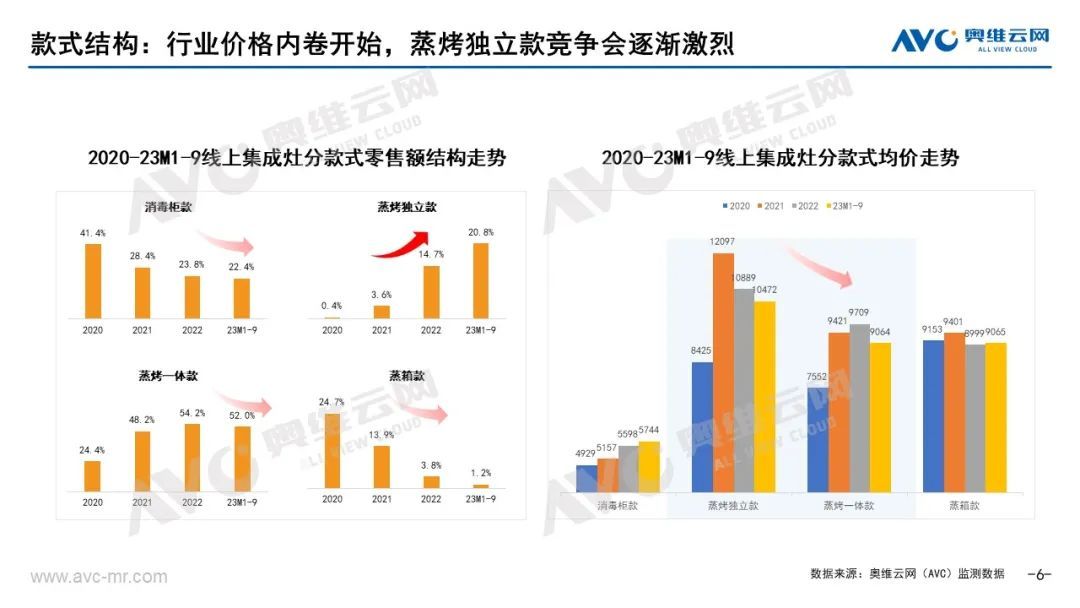 從款式結(jié)構(gòu)看,蒸烤獨立款增長明顯,據(jù)奧維云網(wǎng)(AVC)監(jiān)測數(shù)據(jù)顯示,2023年前三季度集成灶線上蒸烤獨立款零售額占比20.8%,相較于去年全年增長6.1個百分點。但蒸烤獨立款在規(guī)模提升的同時價格出現(xiàn)了下滑,據(jù)奧維云網(wǎng)(AVC)監(jiān)測數(shù)據(jù)顯示,2023年前三季度,蒸烤獨立款均價為10472元,相較于2022年下降了417元。未來,蒸烤獨立款會成為集成灶內(nèi)部競爭的焦點。