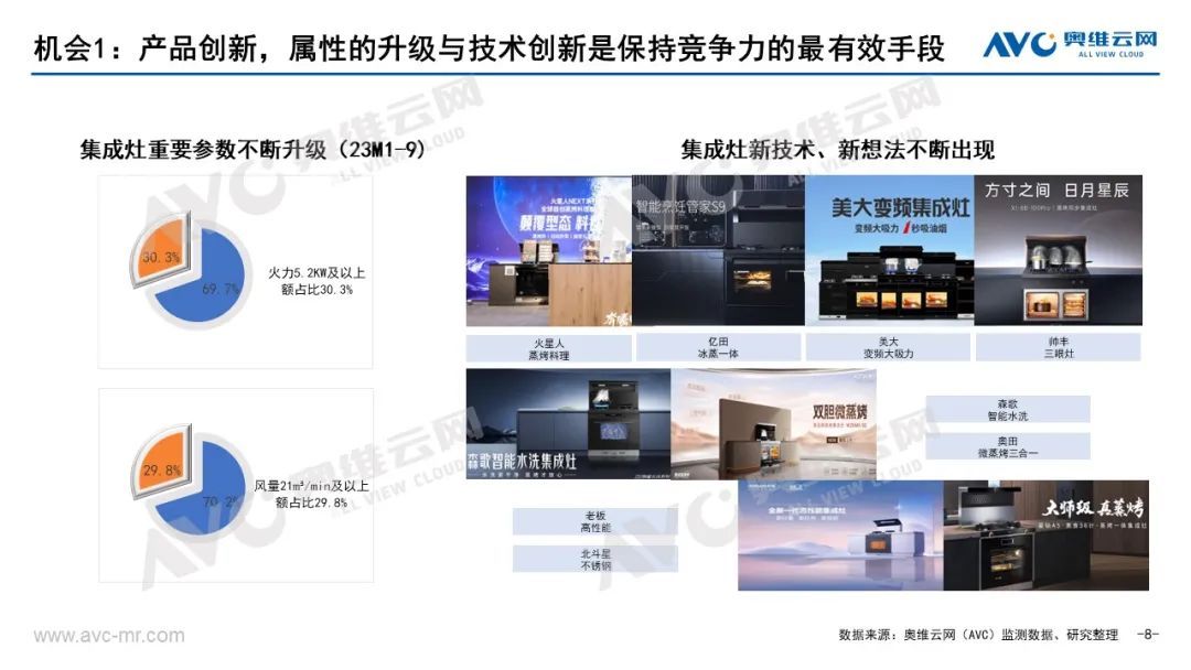 機會1:產(chǎn)品創(chuàng)新。在集成灶市場飽和,產(chǎn)品同質(zhì)化嚴重的情況下,產(chǎn)品的創(chuàng)新是樹立品牌競爭差異點、吸引消費者、搶占市場份額的最有效手段。如火星人的蒸烤料理集成灶、億田的冰蒸一體集成灶、美大的變頻大吸力集成灶、帥豐的三灶眼集成灶、森歌的智能水洗集成灶、奧田的微蒸烤一體集成灶、老板超性能集成灶、北斗星不銹鋼一體集成灶等都對品牌聲量的傳播和銷量的轉(zhuǎn)化提供了很大的助力。