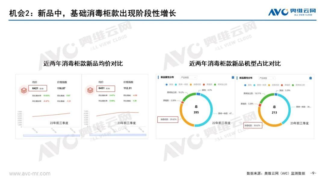 機會2:基礎(chǔ)款階段性回歸。在消費降級趨勢的影響下,集成灶基礎(chǔ)款出現(xiàn)了階段性的增長。據(jù)奧維云網(wǎng)(AVC)監(jiān)測數(shù)據(jù)顯示,2023年前三季度,線上集成灶消毒柜款新品均價為6451元,同比增長30元;消毒柜款新品機型數(shù)量占比36.6%,同比增長7.0%。