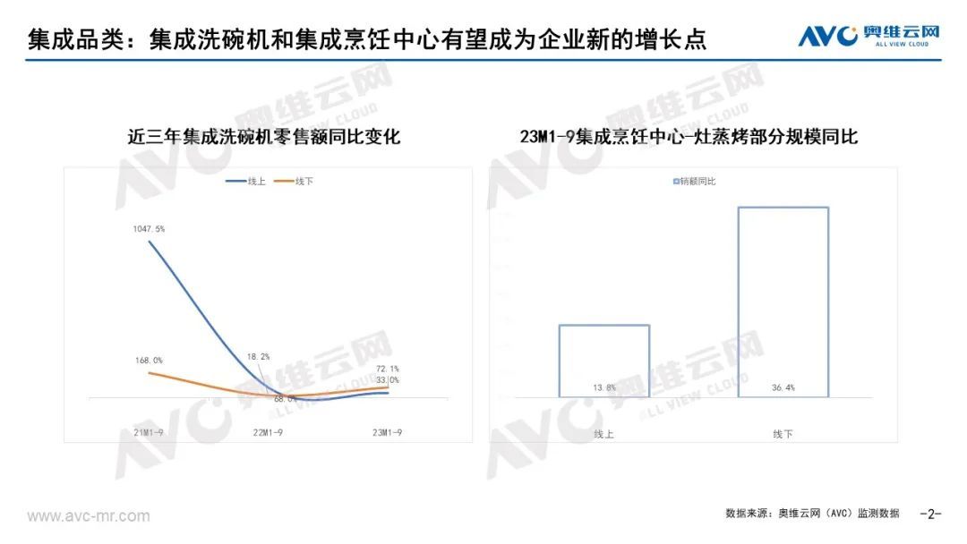 不同于集成灶的下滑承壓,2023年前三季度集成洗碗機與集成烹飪中心呈現(xiàn)了快速增長態(tài)勢。據(jù)奧維云網(wǎng)(AVC)監(jiān)測數(shù)據(jù)顯示,2023年前三季度,線上集成洗碗機零售額同比增長33.0%;線下集成洗碗機零售額同比增長72.1%。線上集成烹飪中心-灶蒸烤部分零售額同比增長13.8%;線下集成烹飪中心-灶蒸烤部分零售額同比增長36.4%。