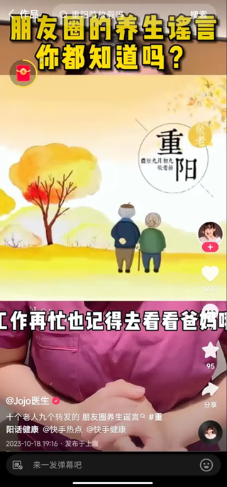 目前,快手健康垂類創(chuàng)作者數(shù)量規(guī)模已超12萬,僅平臺認(rèn)證公立醫(yī)院醫(yī)師數(shù)量就超1萬。這些數(shù)量龐大的專業(yè)創(chuàng)作者成為快手輸出健康知識的第一陣地,也在本次#重陽話健康 話題活動中帶來諸多“重陽健康錦囊”,助力老年健康。