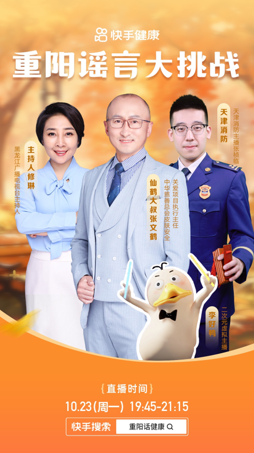 此外,還有許多熱心的專業(yè)醫(yī)生為快手老年用戶帶來特色健康直播,@仙鶴大叔張文鶴便攜手@天津消防 、@主持人修琳 ,用幽默風(fēng)趣的內(nèi)容,一起暢聊老人日常健康生活息息相關(guān)的疾病、慢性病和生活方式等話題,幫助銀齡人群健康過重陽。