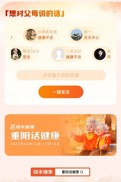 如今,快手已經(jīng)為老年人搭建起通俗易懂的健康內(nèi)容生態(tài),并打造了諸多類似#重陽話健康 的熱門話題。同時快手充分發(fā)揮平臺屬性,成為連接年輕人和中老年的“數(shù)字橋梁”,深入觸達(dá)家庭群體,共同構(gòu)建和諧健康的家庭。例如在此次活動中,快手還專為年輕人開辟了“年輕人關(guān)愛父母指南”活動板塊,讓他們向父母發(fā)送心里話和祝福,既增添了趣味,又讓活動更多出了人情味。