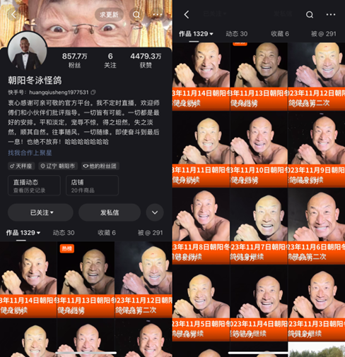 與此同時(shí),“冬泳怪鴿凜冬將至”“下雪了但朝陽怪鴿在冬泳”“籃球人也愛冬泳怪鴿”“冬泳怪鴿轉(zhuǎn)場(chǎng)挑戰(zhàn)”等多個(gè)“冬泳怪鴿”的相關(guān)內(nèi)容及玩法,在快手站內(nèi)熱度飆升,并先后登上多個(gè)熱榜。這并不是“冬泳怪鴿”首次走紅,“直面恐懼的巨魔戰(zhàn)將”“臉上自帶括號(hào)的男人”“最窮頂流”“最具人格魅力的怪人”等都曾經(jīng)是屬于他的個(gè)人標(biāo)簽,那句“奧利給”更是令人耳熟能詳。