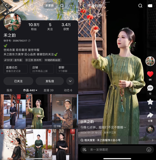 誕生于江蘇常熟產(chǎn)業(yè)帶的禾之韻,其旗下新中式服裝承襲了江蘇濃厚的歷史文化底蘊(yùn),典雅、溫柔。去年7月,禾之韻來(lái)到快手平臺(tái)著手經(jīng)營(yíng)起自播賬號(hào)。入局之初,她主要采用外拍類(lèi)視頻,借助專業(yè)拍攝手法,傳遞品牌新中式格調(diào)和品牌品質(zhì)定位。
