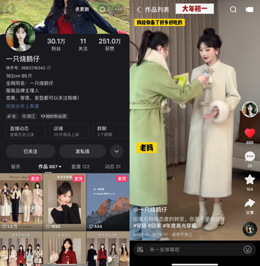 相較于潛移默化實(shí)現(xiàn)種草的“禾之韻”,誕生于環(huán)杭產(chǎn)業(yè)帶的快手主播“一只燒鵝仔”更傾向于新中式服裝美的具象展現(xiàn),聚焦生活場(chǎng)景的穿搭內(nèi)容成為賬號(hào)經(jīng)營(yíng)的主要方向。
