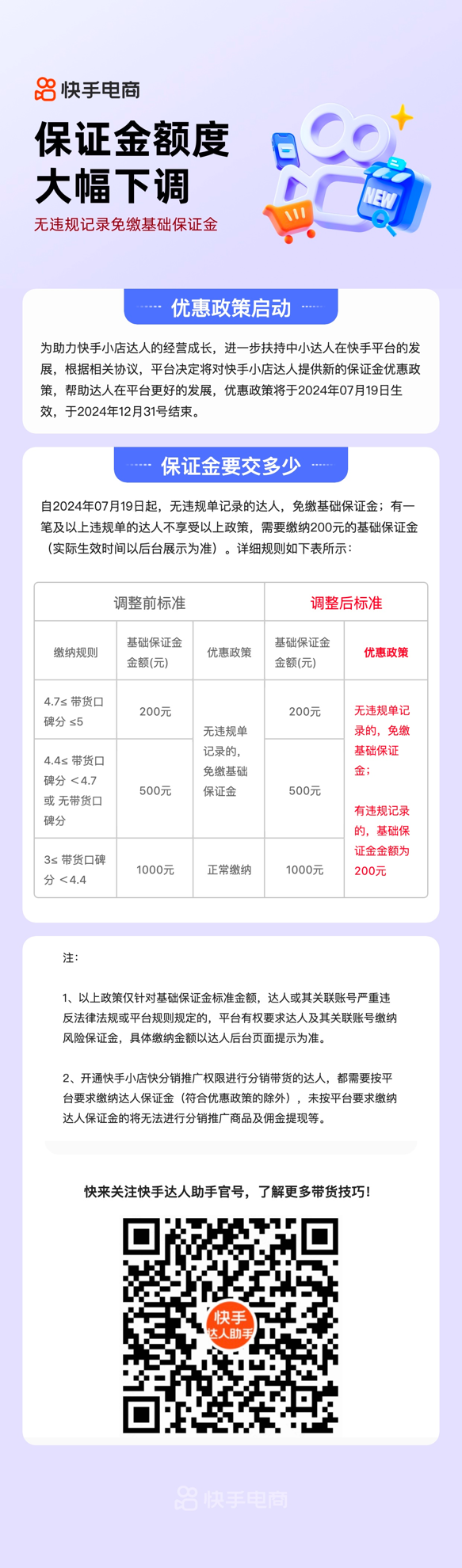 對于大多數(shù)中小達(dá)人而言,因規(guī)模限制,在生意經(jīng)營各環(huán)節(jié)所能投入成本也相對有限。為了減小中小達(dá)人經(jīng)營壓力,快手電商推出保證金優(yōu)惠政策,在此前200元、500元、1000元三個檔位基礎(chǔ)保證金的基礎(chǔ)上,大幅下調(diào)保證金額度。在2024年7月19日至12月31日期間,無違規(guī)單記錄的達(dá)人可免繳基礎(chǔ)保證金,實(shí)現(xiàn)0元帶貨;有一單及以上違規(guī)單的達(dá)人則僅需要繳納200元的基礎(chǔ)保證金。且此前已繳納保證金的達(dá)人,也可按照新政策規(guī)則申請相應(yīng)的退款。