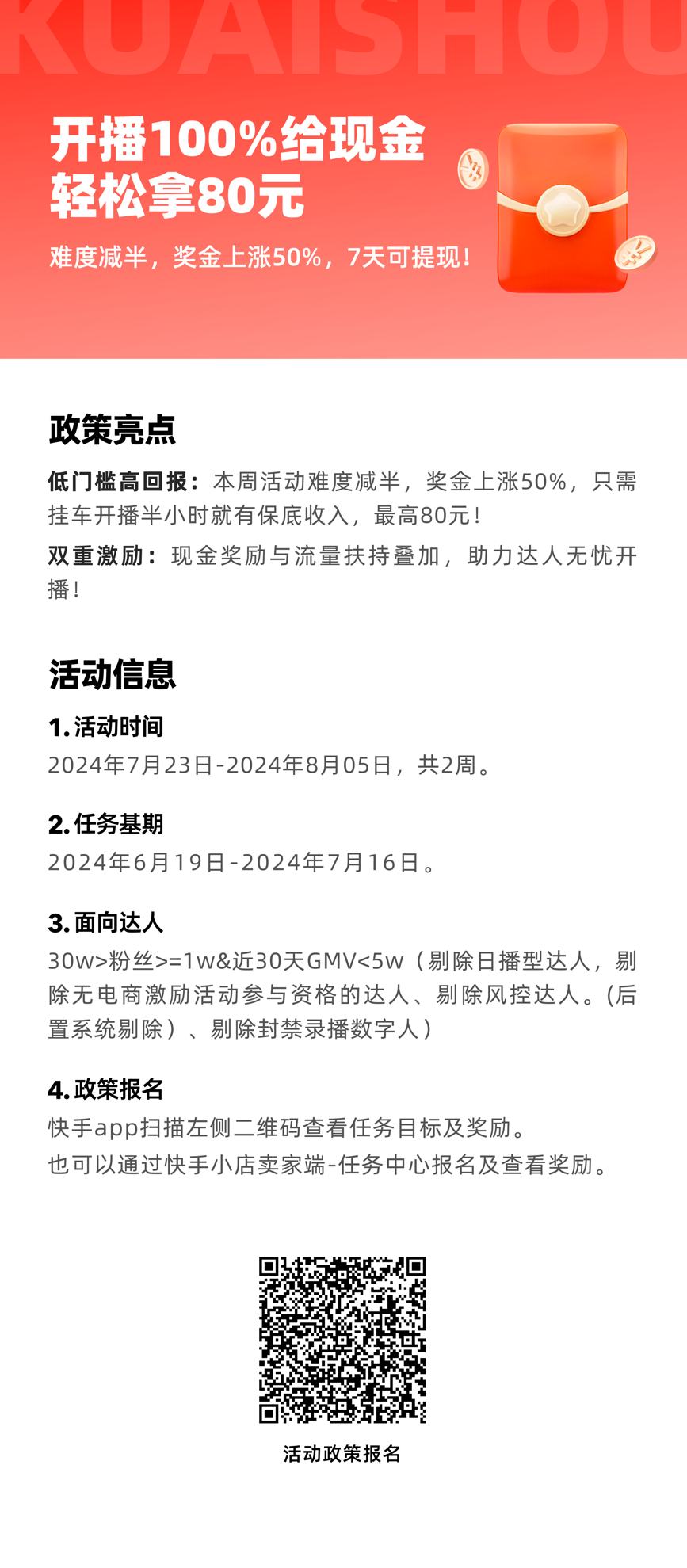 2024年7月23日-8月5日期間,滿足活動參與資格的達(dá)人開播掛車半小時,即可獲得15元現(xiàn)金保底獎勵,多播多得,每周最高可領(lǐng)80元。此外,達(dá)人還可享受現(xiàn)金獎勵與流量扶持疊加的雙重激勵,并可根據(jù)自身風(fēng)格選取官方高分補(bǔ)貼品,以自帶流量的優(yōu)質(zhì)好物,助力直播順利開單。