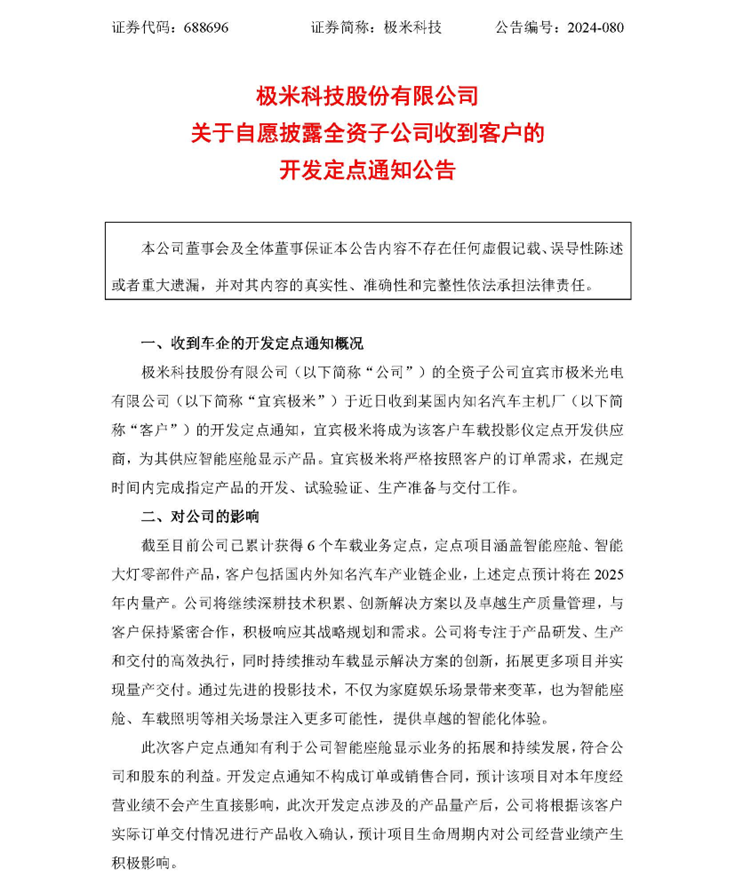 極米科技于12月14日發(fā)布公告,其全資子公司宜賓市極米光電有限公司(簡(jiǎn)稱“宜賓極米”)近日收到某國內(nèi)知名汽車主機(jī)廠的開發(fā)定點(diǎn)通知,宜賓極米將成為該客戶車載投影儀及幕布定點(diǎn)開發(fā)供應(yīng)商,為其供應(yīng)智能座艙顯示產(chǎn)品。自今年年初成立車載事業(yè)部以來,極米科技已獲得6個(gè)車載業(yè)務(wù)定點(diǎn),涉及智能座艙和智能大燈部件,客戶包括國內(nèi)外知名汽車企業(yè)。預(yù)計(jì)這些項(xiàng)目將于2025年實(shí)現(xiàn)量產(chǎn)。