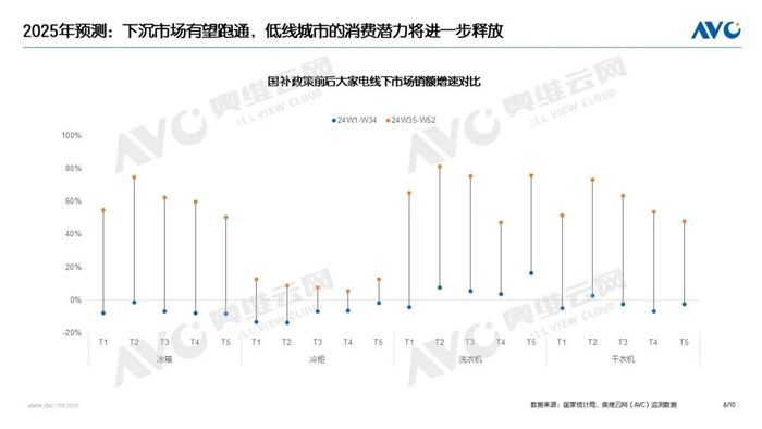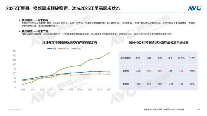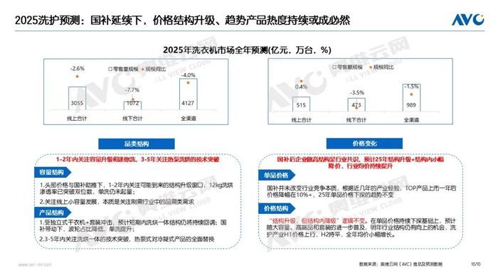 展望2025年,國補(bǔ)政策明確落地,對2025年冰洗市場的穩(wěn)步發(fā)展提供了強(qiáng)有力的支持。相較于2024年一線二線市場的換新需求被有效釋放,2025年的行業(yè)增長重點(diǎn)則聚焦在低線市場。同時產(chǎn)品結(jié)構(gòu)升級主旋律不變。奧維云網(wǎng)(AVC)預(yù)測,2025年冰箱市場零售量將達(dá)到3918萬臺,同比下降4.3%,零售額1452億元,同比下降1.8%。洗衣機(jī)市場零售量為4127萬臺,同比下降4%,零售額為989億元,同比下降1.5%。在需求維持小幅下降的基礎(chǔ)上,行業(yè)價格持續(xù)走高,預(yù)計2025年冰洗市場均價提升2.5%。